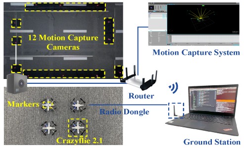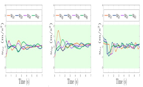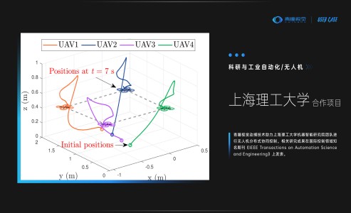 研究团队提出了一种集成速度阻尼和新型非线性饱和函数的分布式控制方法,在不违反输入幅值和速率限制的情况下,实现多智能体状态的一致性。基于CHINGMU(青瞳视觉)动捕系统亚毫米级定位及高精度捕捉的优势,帮助团队实现实时定位采集无人机的位姿、飞行轨迹等运动信息,为算法验证提供精确的数据参考,保障了实验的真实有效性。