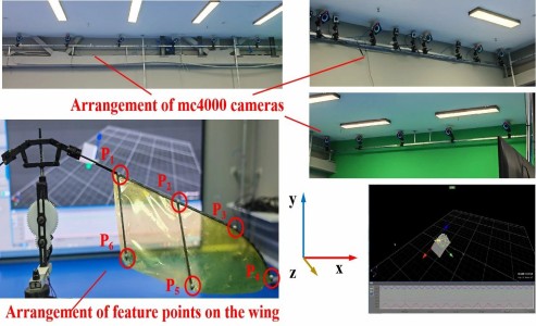 相关研究实验由升力测试系统、飞行系统、动作捕捉系统等组成。其中,CHINGMU(青瞳视觉)光学动捕系统可对FWR的物理运动进行精确的捕捉呈现,以保障实验数据的可靠有效性。该系统基于MC4000动捕相机和CMTracker软件,通过动捕相机捕捉机翼表面上6个荧光特征点的时变位置信息,再由CMTracker软件导出位置变化数据,进而通过计算得到机翼的扭转运动、旋转运动和拍动运动曲线。研究表明,10°~70°预设扭转角的选择和弹簧的应用都可以提高FWR的升力效率,这为进一步提高FWR的气动性能提供了两种可行的策略。