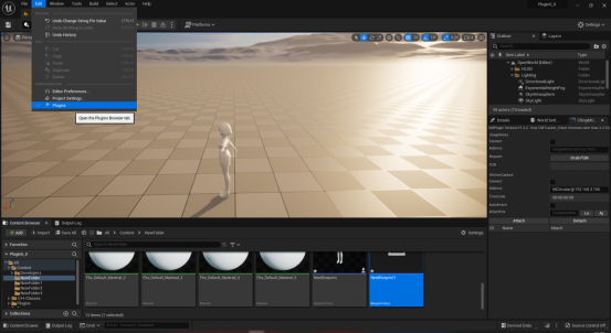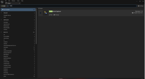 进入虚幻编辑器工程,在左上菜单找到Edit按键,单击打开Edit菜单,单击Plugins进入插件管理界面。如图1-2所示。在搜索栏输入CMMotionCapture搜索插件。勾选左边的勾选框激活插件,然后重启工程。如图1-3所示。