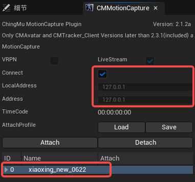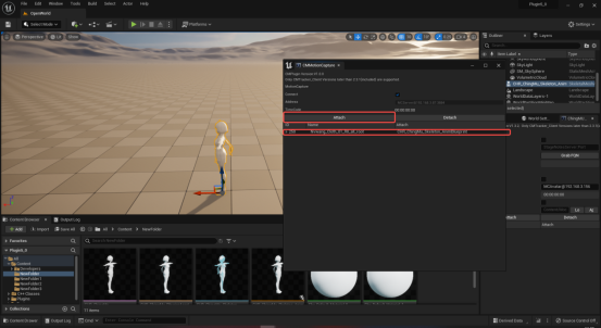 如果要使用界面绑定,将动画节点的ID置为-1。然后将动画蓝图拖动到场景中,在场景内点选使用该动画蓝图的角色和CMMotionCapture界面列表内的数据,点击Attach完成绑定后,点击运行。如图5-3所示。