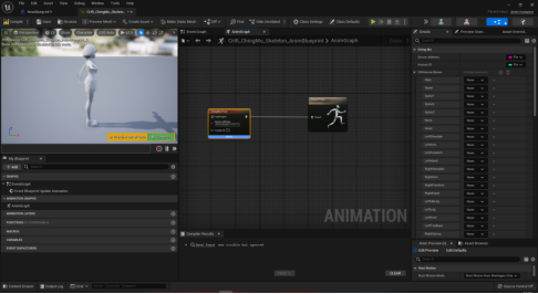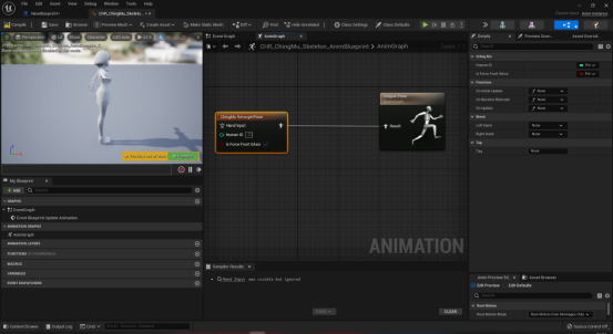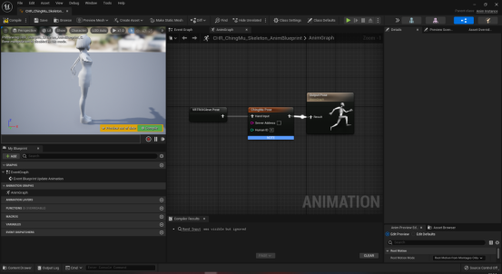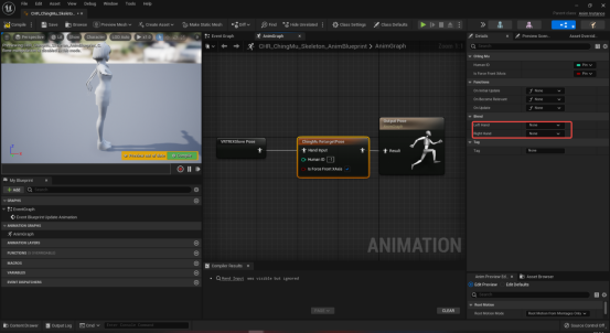 创建对应骨骼模型的动画蓝图,在AnimGraph内点击鼠标右键搜索并创建ChingMuRetargetPose节点。如果你在模型导入时勾选了强制X轴,那么这边也勾选IsForceFrontXAxis,否则反之。在HumanID处输入重定向数据的ID,输入为负数时,模型将根据动捕插件界面的绑定驱动动作。如图5-2所示。