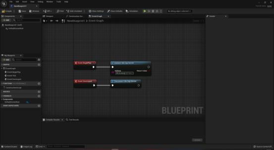 打包后如果需要使用重定向功能需要在蓝图内创建连接服务器逻辑。在蓝图中右键点击搜索ConnectMoCapServer创建连接服务器蓝图节点,在Adress属性内输入动捕服务器地址。在蓝图中右键点击搜索DisconnectMoCapServer创建断开服务器蓝图节点。如图7-1所示。