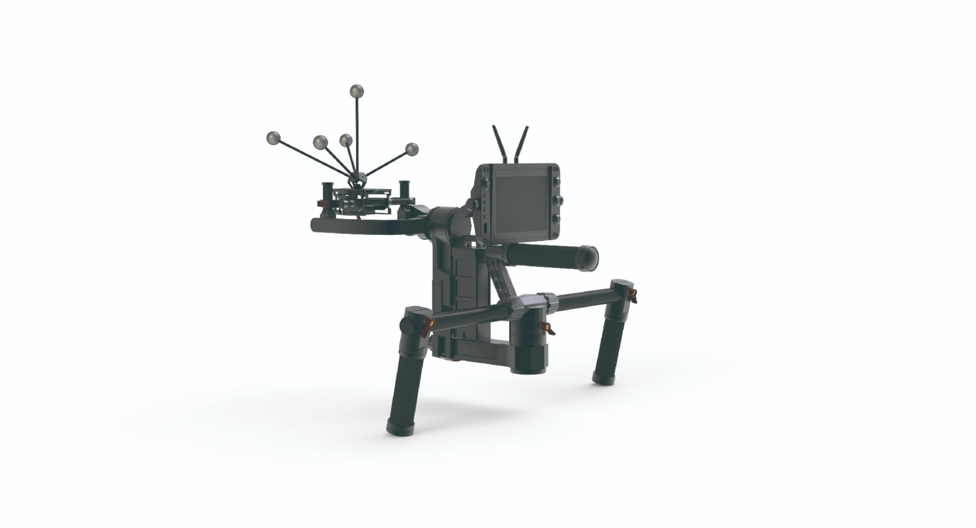 虚拟相机集成手持云台结构与操作手柄,可实时连接虚幻引擎等主流虚拟引擎,发送位移、旋转以及 Zoom、Focus 等模拟相机参数。设备内置返屏,支持实时预览虚拟场景画面,配合定位刚体,可将真实空间中的运镜动作同步映射至虚拟场景中。该方案让摄影师以真实相机的操作方式完成虚拟运镜,广泛适用于虚拟制作、预演(Previs)、虚拟拍摄与镜头设计等应用场景。