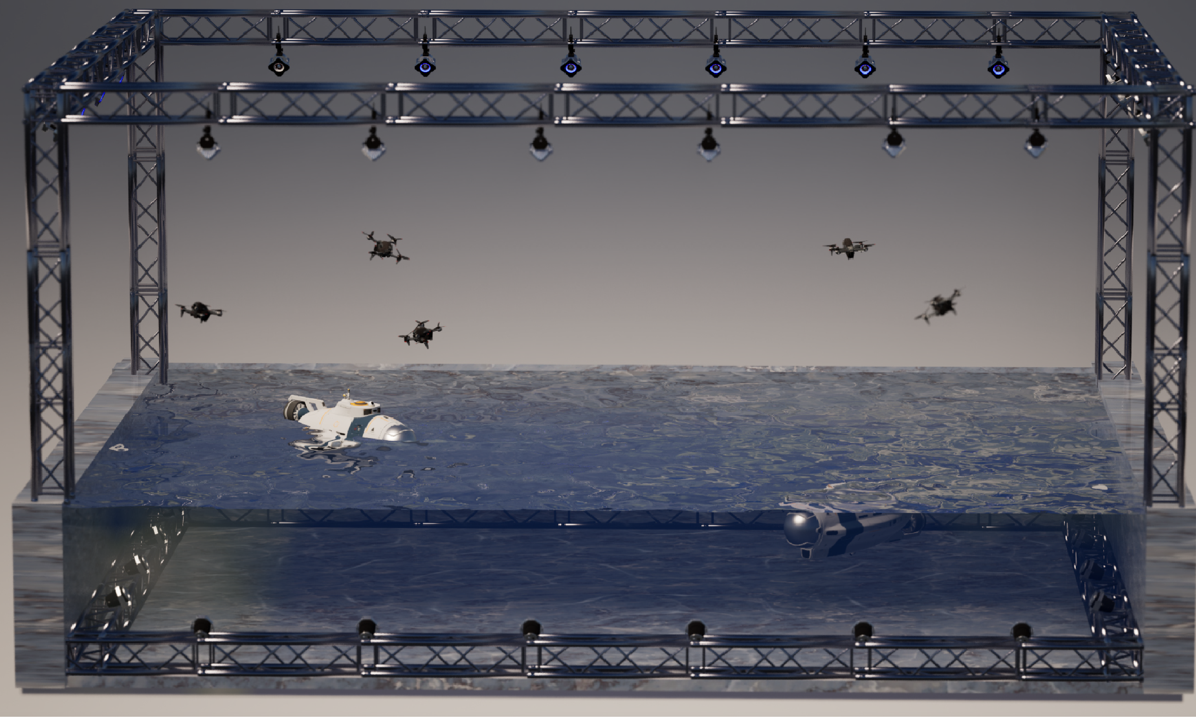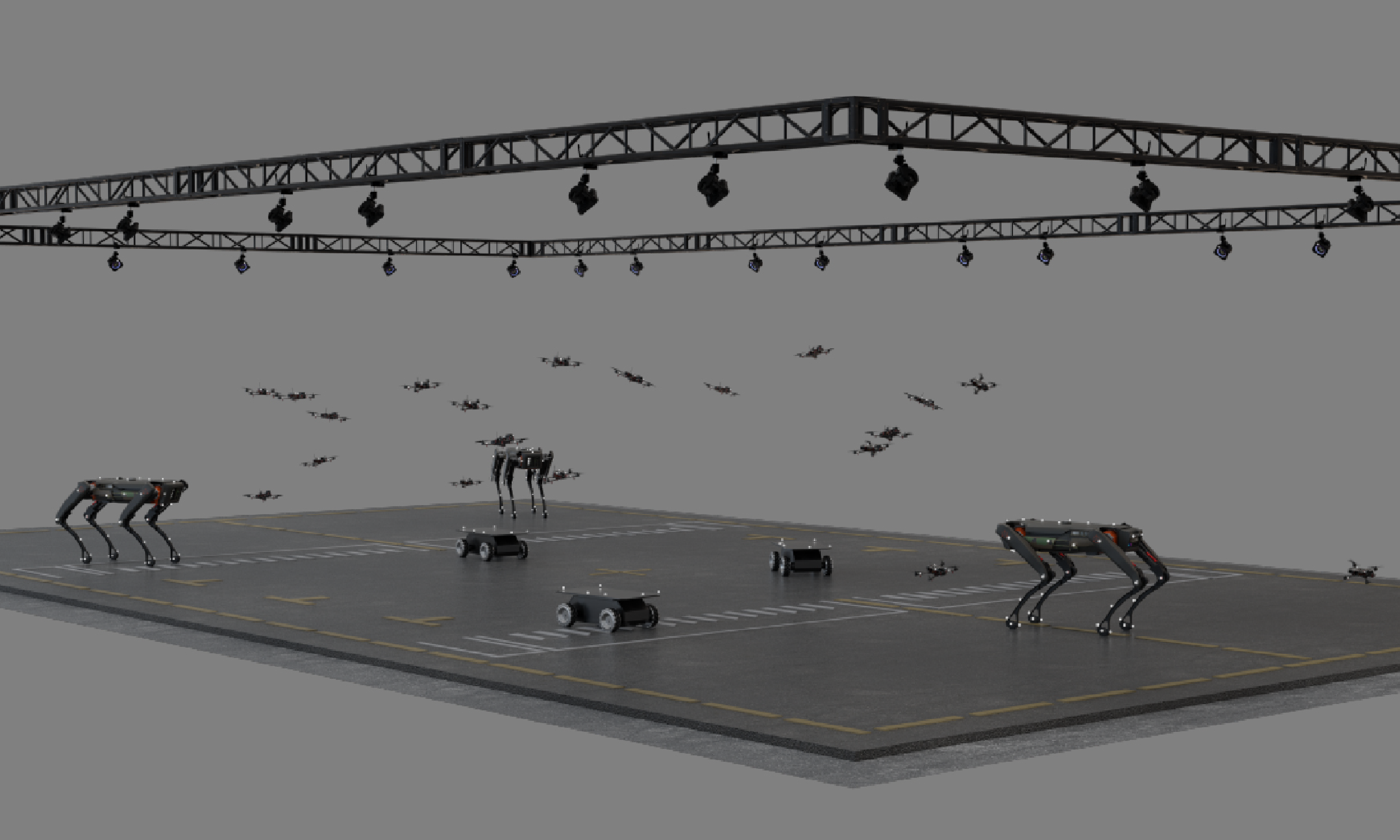 青瞳视觉无人系统解决方案,主要用于复杂环境下空地协同无人系统集群控制等相关算法的地面验证,致力于构建“空地一体、虚实融合、智能协同”的一站式平台,将无人机、无人车、机器狗、水面/水下USV、ROV、AUV等多类型智能体统一纳入水陆空协同体系。通过部署红外动作捕捉系统,实时采集智能体轨迹与位姿数据,随后在此基础上开展相关多智能体集群协同算法验证,具备多维度、多层次、多场景的实验能力。